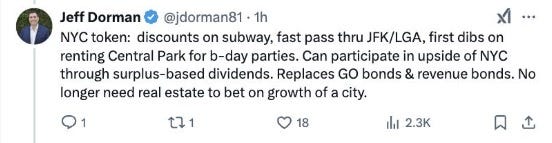 Compare this with memecoins. While digital jokes capture headlines, the real potential of tokenization lies in solving tangible problems. A comprehensive NYC token ecosystem could create funding mechanisms that reduce our reliance on wealthy developers while ensuring that the benefits of our cities’ development extend beyond the penthouses of Billionaires' Row.
